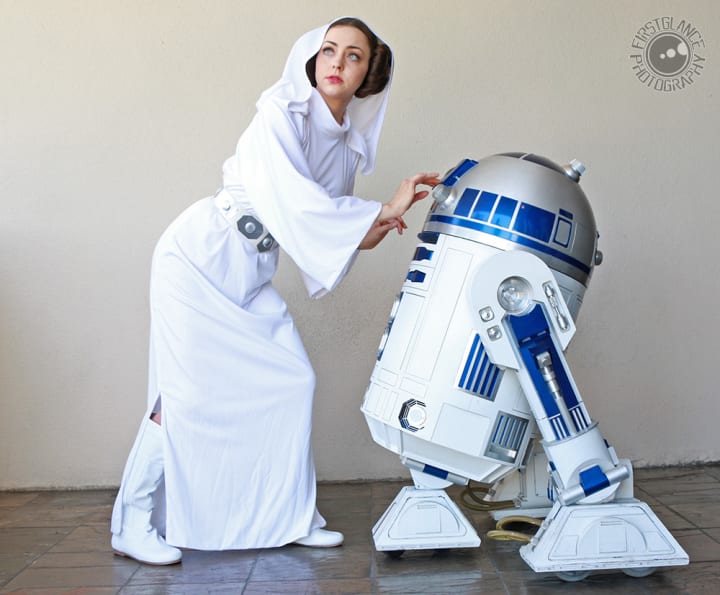 Joanna Lynn as Princess Leia giving R2-D2 the death star plans.