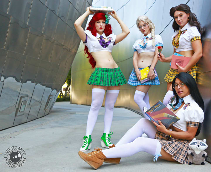 And then there's Ali Williams who, inspired by the Disney Princess', created her own mashup of the schoolgirl meets the Princesses, with a whole crew of cosplayers creating the same look and design.