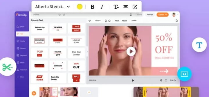 Flexclip's advanced features include animations, auto-subtitles/captions, text-to-speech, background removal, and multiple video editing formats. It also offers millions of royalty-free video resources and is an excellent alternative to Flimora.