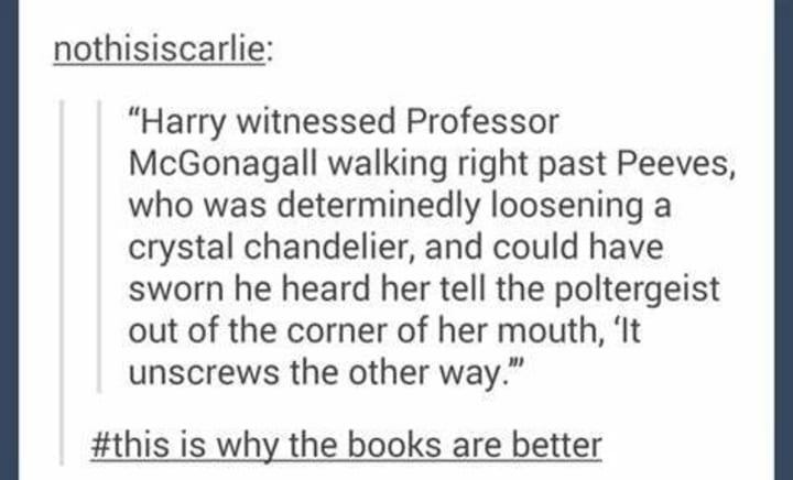McGonagall was one of the first characters to appear in both the books and movies, and in both she was the first to throw shade in the Dursleys' direction. This scene beautifully kicked off the films as a wonderfully accurate adaptation of the series' very first chapter.