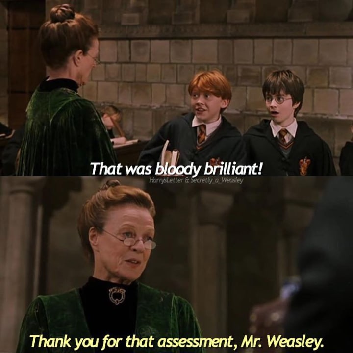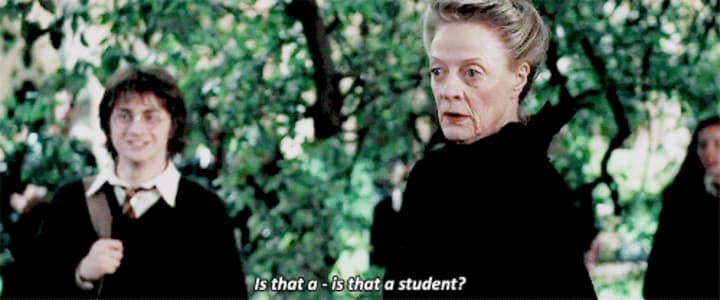 In the movies, however, Harry and Ron showed up late to their first Transfiguration class and had no idea that the cat sitting on the teacher's desk was, in fact, their teacher. When she suddenly transformed before their eyes, Ron was impressed, resulting in this sassy exchange that led McGonagall to ask if the boys needed to be turned into watches or maps to make it to class on time.