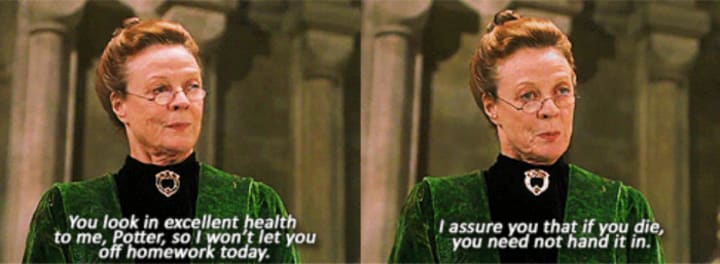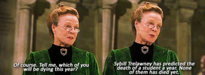 After Professor Trelawney saw the omen of death in Harry's tea leaves, he was, understandably, a bit rattled. As we know, the Divination professor's predictions weren’t all nonsense, with the Seer having delivered the prophecy that ultimately determined the tragic course of Harry’s life. But this one was a total crapshoot, one for which McGonagall had little patience. Apparently being warned of your impending doom isn't enough to get you out of Transfiguration homework.