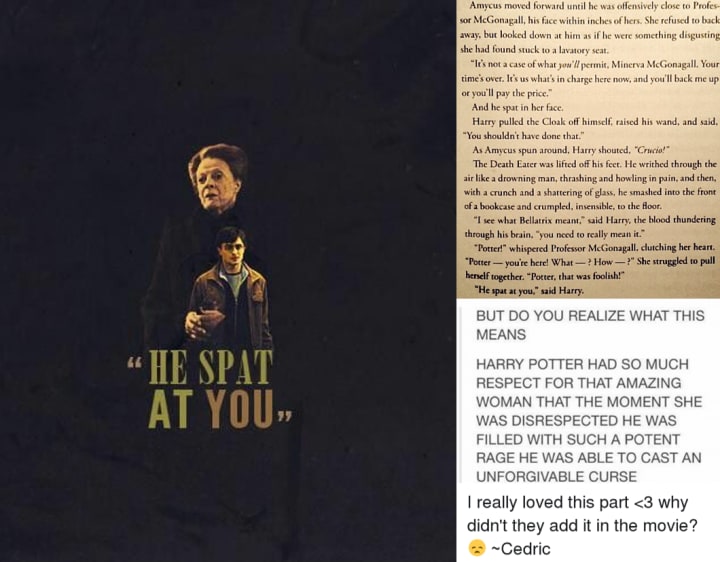 Carrow spat in her face, and Harry went off. The rage he felt was enough to summon an Unforgivable Curse, which told book readers just how protective he had become of the professor who had herself defended him time and again.