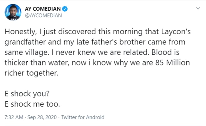 Honestly, I just discovered this morning that Laycon's grandfather and my late father's brother came from same village. I never knew we are related. Blood is thicker than water, now i know why we are 85 Million richer together.