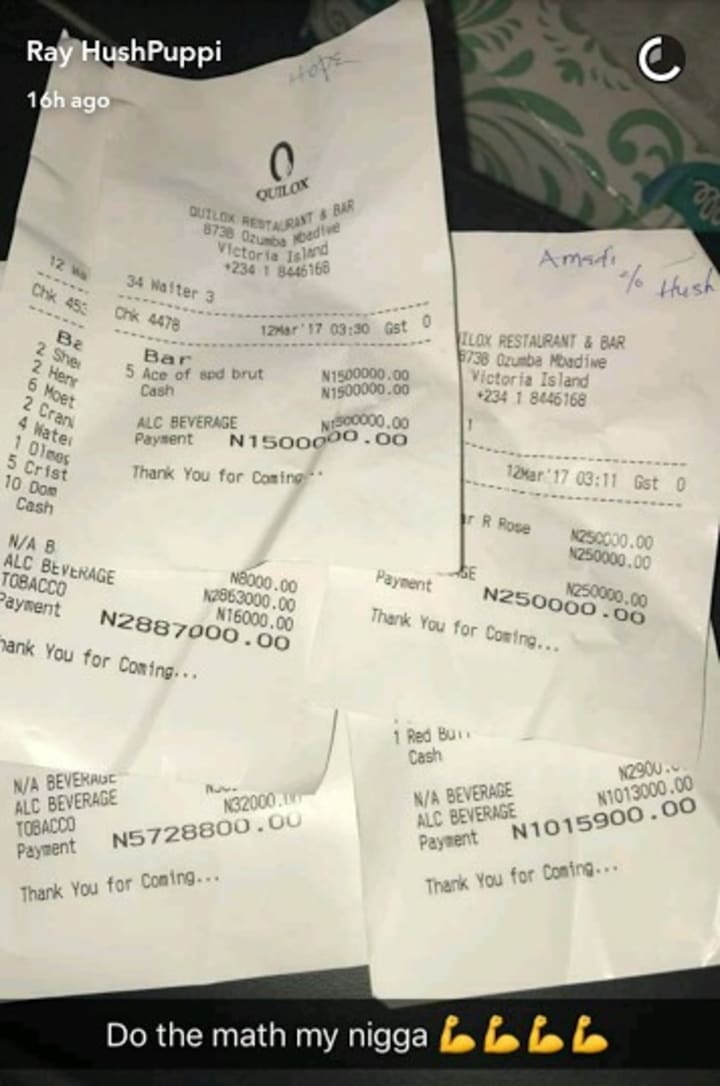 Then at another time, he also posted different receipts from a night out he had which totaled over 11 million naira.