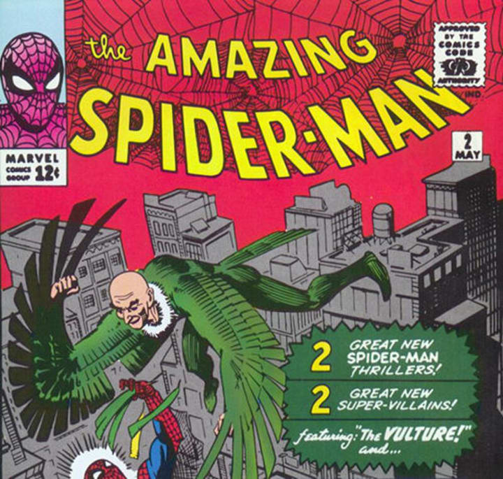 In 1963's The Amazing Spider-Man #2, Parker realized that he could sell pictures to J.J Jameson for some extra dollar- fighting crime is not a well paid job, it seems. Attempting to snap pictures of new villain Vulture, their first meeting saw Spider-Man trapped in a vat by his winged foe (your classic spider-in-the-bath situation). During a second confrontation, Vulture's cockiness soon wore off when Peter attached his anti-magnetic inverter to Vulture's wings. Vulture fell in to a tailspin, and straight into the arms of the police. Peter easily swung away, getting the snaps he needed for Jameson, leaving Toomes to plot his revenge from a jail cell.