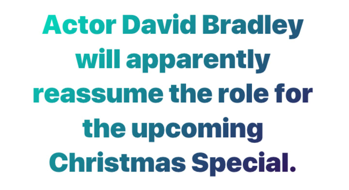 #HarryPotter fans will instantly recognize him for his time as Argus Filch in the acclaimed film series, and #GameofThrones fans will have immediately realized that he also played Walder Frey (Booo! Hiss!), but Whovians know that Bradley already has a history with Who. Certainly, he was the sadistic and villainous Solomon in the #MattSmith episode "Dinosaurs on a Spaceship," and he was previously acquainted with the part of the First Doctor when he played William Hartnell in the TV drama "An Adventure in Space and Time.