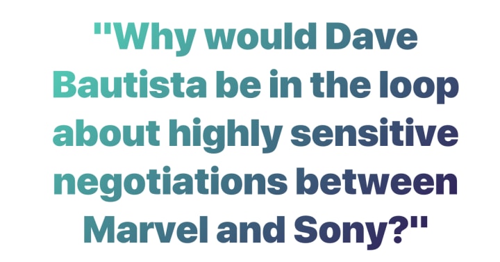Why would Dave Bautista be in the loop about highly sensitive negotiations between Marvel and Sony? He doesn't even have anything to do with the Spider-Man franchise. Despite seeing this headline appear on a number of sites, the reality is that this is just another opinion, aired by someone who actually has nothing to do with the events in question. Bautista was just chatting freely, so it really wasn't worth all the excitement.