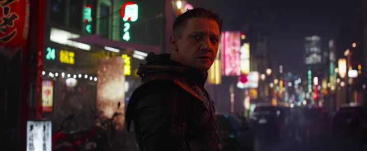 Clint's hair is different and he is in an Asian country in dark clothing. He is also looking at Natasha in this shot.
