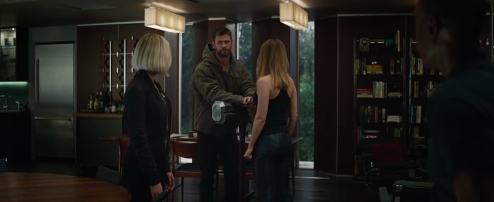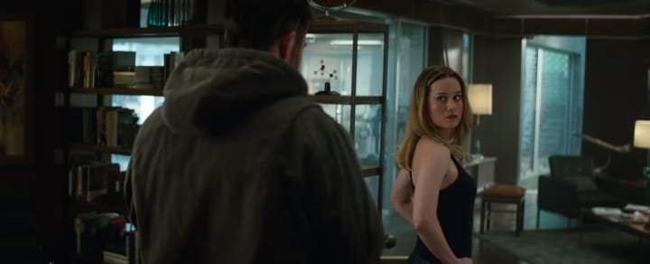The scene had Captain Marvel arriving at the Avengers headquarters and meeting the other Avengers. This scene likely takes place right after, as Thor meets Carol Danvers.