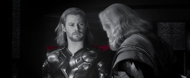 And here, we see archival footage of Thor from Thor and Infinity War. I think Thor has shown the most growth of any of the heroes. He changes a lot from movie to movie.