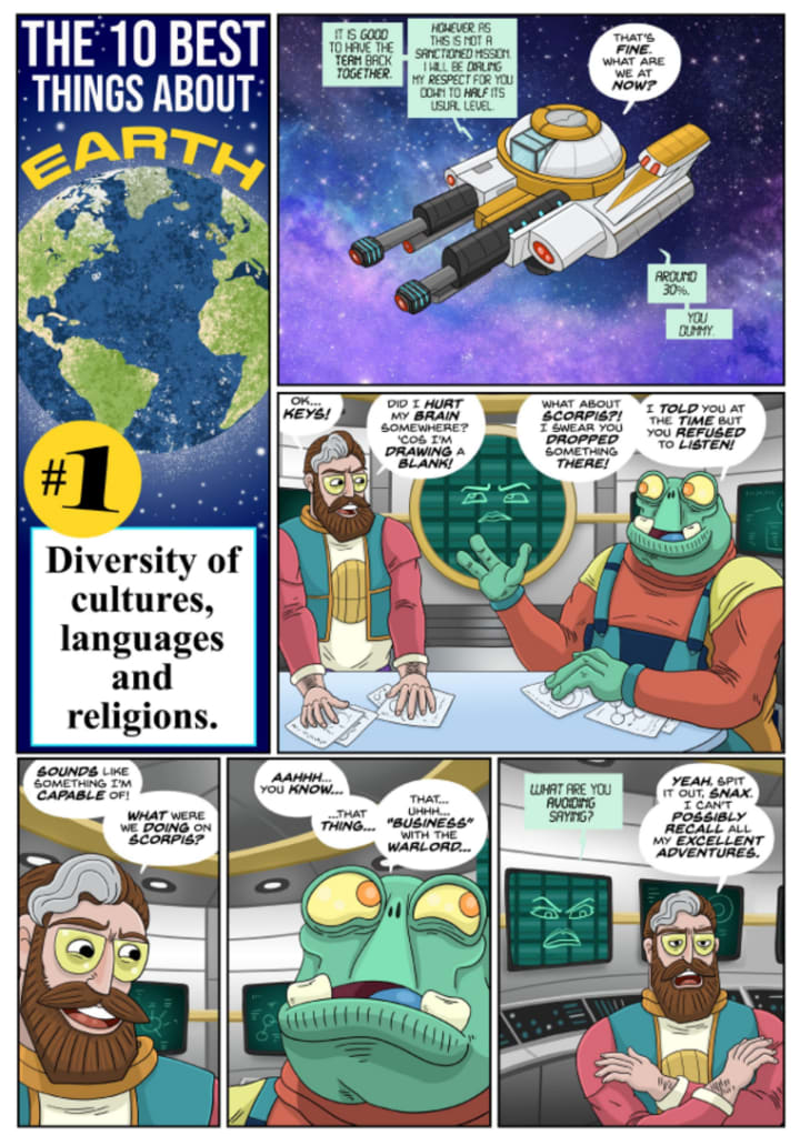 With each chapter, He Lost His Keys in Space gets to explore not just one of the reasons that Ulysses believes Earth is the greatest planet of them all while also unpacking a key aspect of his character. At least, this is the case for most chapters, whereas others uncover major revelations regarding Ulysses' personal history or introduce new characters to the small ensemble cast of characters at the heart of He Lost His Keys in Space.