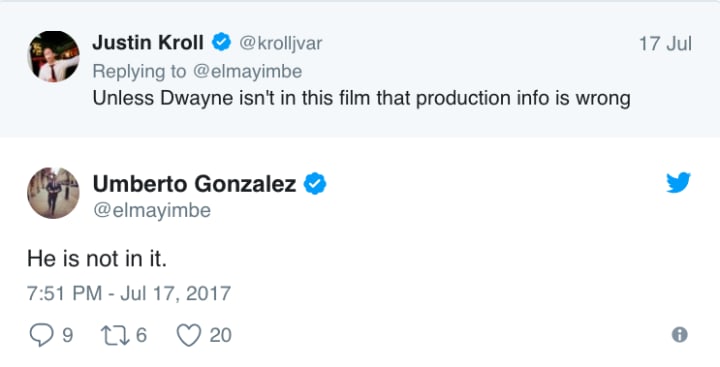 Popular rumor hound Umberto Gonzalez revealed that Dwayne Johnson will not be putting on his Black Adam suit (just yet).