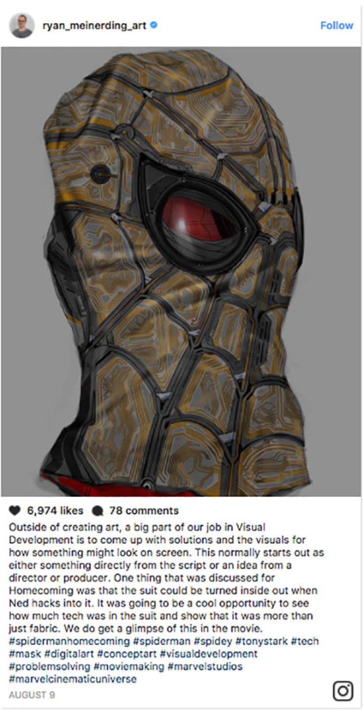 Obviously, the composition of the suit includes more than just stitches and fabric. Thanks to concept artist and Marvel’s current Head of Visual Development, Ryan Meinerding — who presumably designed many of the suits from the MCU — we finally get to see what’s behind that Stark-certified costume. Or, the mask, at least. Have a look below: