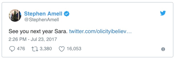 After the post was shared on Twitter, Amell retweeted it and reminded Sara that he would see her next year.