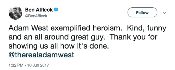 Superhero fans all over the world mourned Adam West, and the bat-signal even shone over Los Angeles for a night. Celebrities and fans across the world poured tribute on Ward for his professionalism and grace.