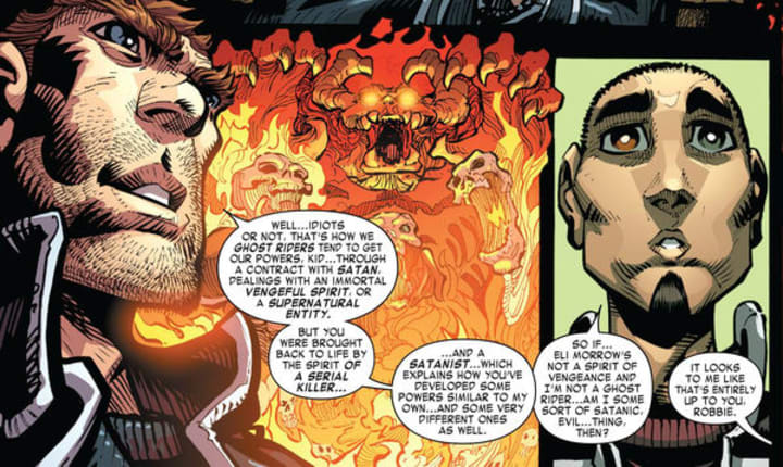 At first, Robbie believes the spirit inhabiting his body is the Spirit of Vengeance, as he goes out passing judgement on a variety of criminals and sadists — like a Ghost Rider would — but when a specific event forces Robbie to venture to hell, he discovers the truth: his body is actually inhabited by the spirit of serial killer, not the Spirit of Vengeance. Although Reyes can wield supernatural abilities similar to that of Ghost Rider, he's not a Ghost Rider within the context of the Marvel Universe.