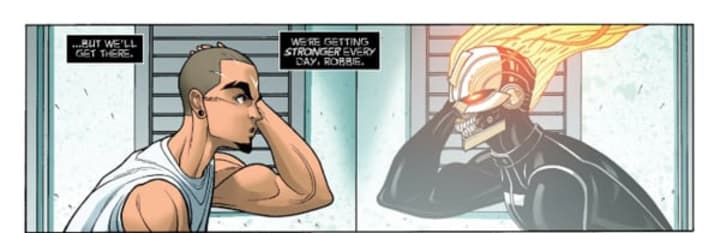 Soon thereafter, an internal conflict would ensue between the two for control over Robbie's body. And it may be that internal conflict which explains Robbie’s struggle with the Ghost Rider in episode five “Lockup,” evident by the episode synopsis.