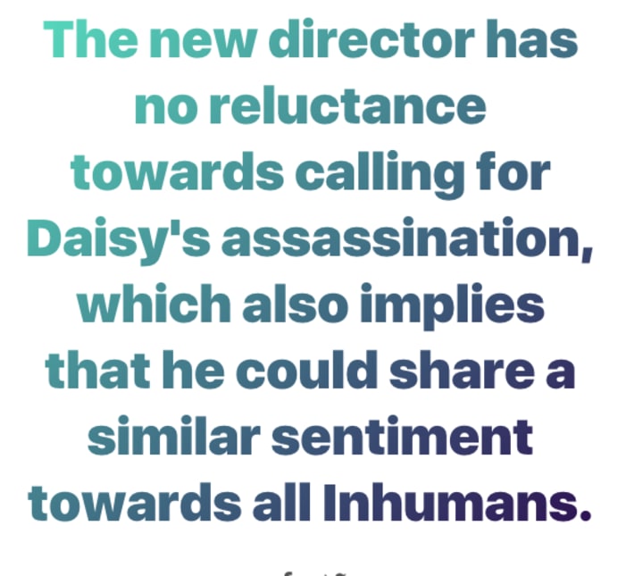 It's apparent that the new director's initiative to capture Daisy comes with a shoot-on-sight order, which means two very important things: 1) Daisy is no longer an asset looking to be acquired by S.H.I.E.L.D., and 2) the new director has no reluctance towards calling for Daisy's assassination, which also implies that he could share a similar sentiment towards all Inhumans.