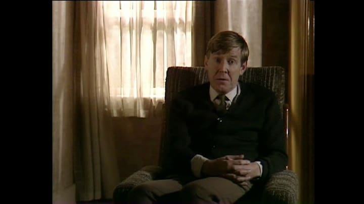 This was the first monologue to air, in no small part because Alan Bennett himself plays the lead role. His surprisingly sinister performance is probably the highlight, but the monologue itself is unremarkable compared to some of the later ones. The contrast between the middle-class liberal Graham and the brash, right-wing Mr Turnbull drives the conflict, especially as his mother Mrs Whittaker turns from parroting Graham’s views to supporting Mr Turnbull’s. Despite his objectionable politics, Turnbull possesses a certain energy, and it is not hard to see why Mrs. Whittaker falls under his spell. Graham’s emotionally repressed, anxious personality is not suited to this sort of battle, and his repeated use of the phrase “I didn’t say anything” highlights his unease with the new arrangement. However, the episode concludes with Graham taking advantage of an eerily convenient revelation which allows him to get rid of Mr Turnbull, regardless of the damage it will do to Mrs. Whittaker’s newfound happiness. The camerawork is strong, with low shots and a closing close-up of Graham adding to the menacing note in Bennet’s performance. “A Chip in the Sugar” is a rather cold story, but its twisted take on mother-son dynamics is certainly interesting.