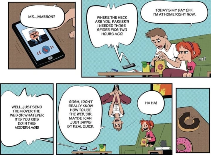 Over in the main Marvel timeline, Spider-Man is currently running Parker Industries and becoming more of an 'Iron Man' type figure (his portrayal in last week's Avengers reboot was disturbingly Stark-esque). This, though, is like coming back to an old friend. It's also all the evidence we need to know that Joe Quesada was wrong. Spider-Man's story works fine with him married or single; you just have to get the right creative team behind him.