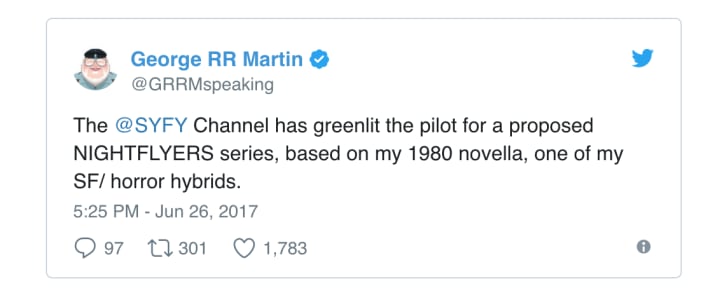 Game of Thrones fans may soon have another series to hold them over while they're awaiting more episodes of their favorite medieval fantasy, as Syfy has ordered a pilot for Nightflyers, another George R. R. Martin production. The author confirmed the news on Twitter on June 26, 2017: