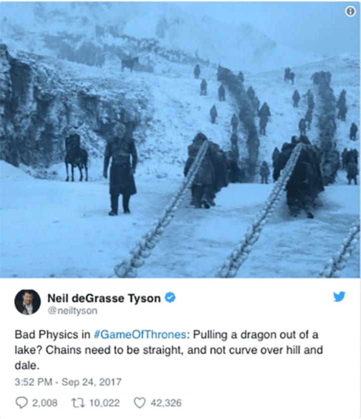 Firstly, Tyson turns his attention to the death of Daenerys Targaryen's "son," Viserion. If you remember, one of her troublesome trio of dragons met a watery grave in the penultimate episode, "Beyond the Wall." Ignoring the logistics of an army of the dead conjuring chains from an icy tundra, Tyson claims that the physics behind hauling the weight of a dragon in such a way would've been impossible. Apparently, even with an army of the undead at your disposal, all the wights in the world wouldn't have been able to pull Viserion from those doomed depths.