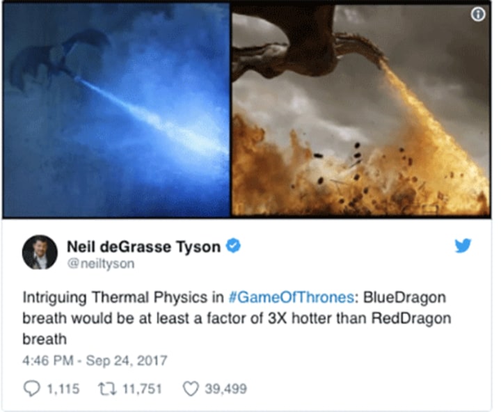 When Season 7 came to a close, we saw the game change and a dangerous new threat blast the competition with the reveal of that third dragon rider. We have all heard of something burning "white hot," but now scientist Neil deGrasse Tyson has pointed out a potential blue bombshell for the final series of #GameofThrones and possibly the loss of another one of our flapping friends.
