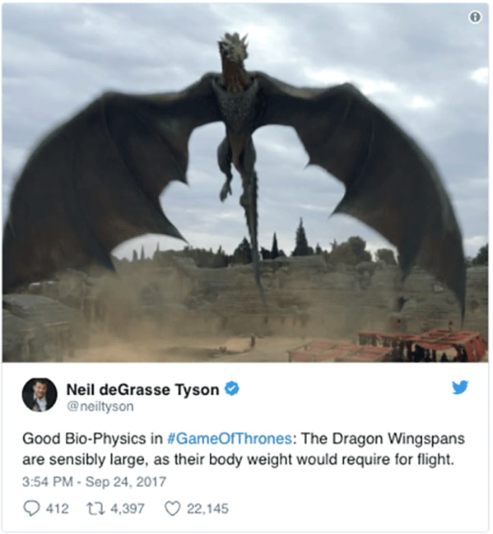 Admittedly, I am no dragon, but I wouldn't fancy my chances taking on someone who was packing such a substantial punch. Sure, Drogon may have the size, but Viserion has one heck of an advantage with those lungs of his. However, it isn't all doom (of Valyria) and gloom, and Tyson does praise HBO for accurately representing the wingspan of the dragons.