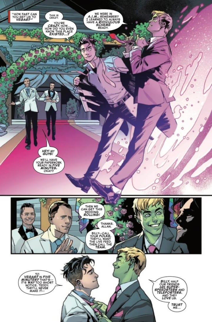 As a Kree-Skrull hybrid, Teddy is prophesised to bring peace to the warring races. Unfortunately, this means he faces regular attempts on his life from members of both races who would prefer the war went on. Relatively early in the story, Teddy enters into a romantic relationship with his teammate, Wiccan, whom he eventually marries.
