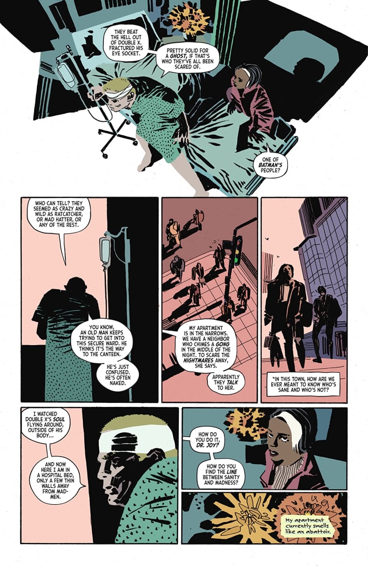 I’m enamoured with this story. At first I thought it was simply going to be another Batman tale but lo and behold he’s far from the pages of this book. Instead it focuses on Dr. Joy and those inmates who survived the Joker gas attack and some members of the GCPD who are out there to recapture them. It is weird, warped and twisted and preys upon the memory of Amadeus Arkham and involves the man who founded Gotham. Twisted, brilliant, creepy and daring this is what the story evokes and thanks to the immaculate writing, brilliant characterisation and delightfully bespoke interiors we get all this and more.