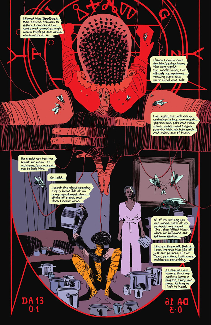 I am a huge fan of the way that this is being told. The story & plot development that we see through how the sequence of events unfold as well as how the reader learns information are impeccably rendered. The character development that we see through the narration, the dialogue, the character interaction as well as how we see them act and react to the situations and circumstances which they encounter does a magnificent job in continuing to flesh out their personalities. The pacing is amazing and as it takes us through the pages revealing more of the story the more we are drawn into the ever darkening madness that is the legend of Arkham.