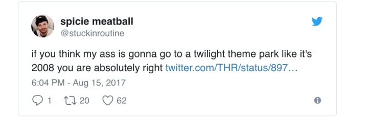 However, there will be rides at the new Twilight park (along with restaurants and shops across 1.3 million square feet), according to The Hollywood Reporter — though it's doubtful one will be a mechanical vampire. (A vampire zip line over tree tops would be cool.) Regardless of what the attractions are, Twihards are extremely excited about this next step in the Twilight adventure.