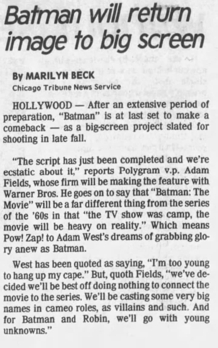 There are no confirmed studio announcements, no screen tests, no contracts signed. The project stalled in development, lingering as Warner Bros. struggled to decide what Batman should be in a post-Adam West world.