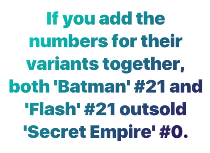 But here's the catch. The lenticular cover meant these books had a higher price. Diamond's sales estimates aren't about who "won" in a given month — they're there to help retailers work out what books to order. So whenever a company publishes variants at different prices, Diamond deliberately splits them up. It's a massive help to retailers, but it means that Marvel got the top-seller for last month — even though, if you add the numbers for their variants together, both Batman #21 and Flash #21 outsold Secret Empire #0.