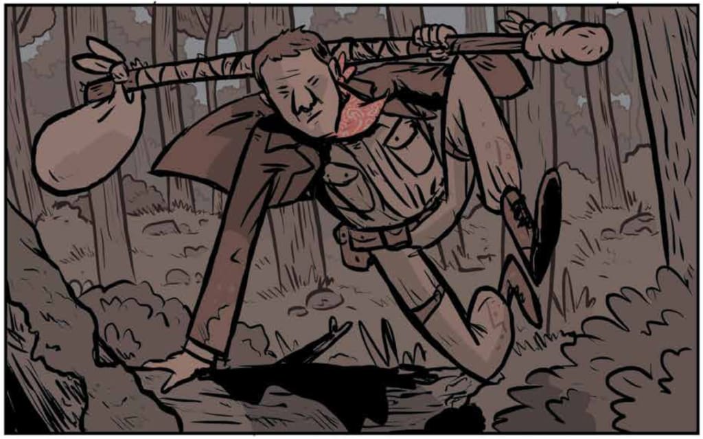 That sentence above is the opening line in Rock Candy Mountain, written and drawn by Kyle Starks (of Sexcastle and the Rick and Morty comic on ONI press). Not only is that the first sentence, but it is being by screamed by Satan himself in the year 1948, as he punches through the heads of classic looking hobos. If that's not an amazing way to start a series off, then I no longer know what amazing means. That's only a taste of what Rock Candy Mountain has to offer the readers. Sadly, we only get a few pages of Satan before the focus shifts over to the man The Devil is looking for, the mysterious Jackson, who is searching for the infamous “Rock Candy Mountain” of folk song lore. Jackson is riding the rails when he comes across another, albeit vastly different wayward soul (who we come to know as Pomona) and helps him out of a bind, and then the two have to face down the hobo mafia.