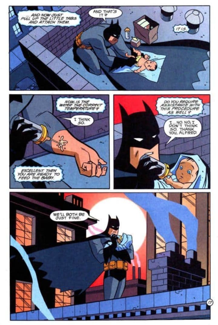 This is evidenced by his training of the various Robin’s, to not only aid him fight crime, but to help them overcome their personal problems. There s other evidence in both comic form, not only where he looks after children (as seen below) but where he actively assists in the rehabilitation of his villains.