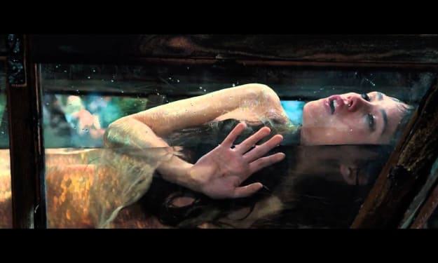 A key twist occurs when it is revealed that the ritual to activate the Fountain requires two silver chalices and a tear from a mermaid. Philip Swift (Sam Claflin), a missionary held captive by Blackbeard, falls in love with Syrena (Astrid Bergès-Frisbey), a captured mermaid, who sheds a tear for him. Angelica unintentionally saves Jack's life by drinking from the Fountain using the chalice meant for Blackbeard, unknowingly absorbing her father's remaining years when he pushes her into the other chalice, sealing his demise and saving hers. The movie concludes with Angelica marooned on a deserted island, potentially to be rescued by Jack, and Barbossa regaining control of the Queen Anne's Revenge, now equipped with Blackbeard's magical sword. The narrative style blends adventure, romance, and supernatural elements, maintaining the franchise's signature blend of humor and action.