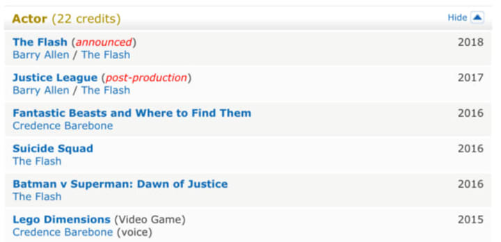 Warner Bros. is clearly pushing Ezra Miller as their golden goose, almost too much. His brief appearance in Batman v Superman added some much-needed comedy relief in the film, but there is no need to cram him into all your works. If you look at the actor's IMDb, his six most recent roles are all tied to the fabled studio:
