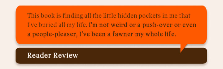 One of the main concepts she wants the reader to understand is that 'people-pleasing' is not a moral failure but rather a trauma response where the person tries to disarm a situation by doing something called "fawning". This is where the person becomes extremely conflict-avoidant. Once this person grows up having to have managed the emotions of particularly volatile adults in their life by disarming situations, they carry that over and end up burning themselves out over the emotions of others. This is not only bad for the individual doing the fawning, but it also leaves them open to emotional manipulation. When I was looking up the statistics for people who are emotionally manipulated and simply believe that they are doing the right thing, I found thousands upon thousands of stories.
