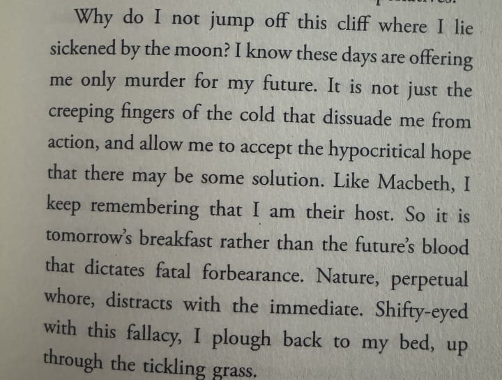 Passion, despair and love are three of the key emotions that underline this unconventional novel of prose poetry. Compact as it is, it still seems to cover these emotions in great depth, complete with meditations and philosophies on how things become more and more misunderstood as life goes on. There's a passage I particularly loved in this book in which the author discusses suicide in a way that is purposefully shaded by other thoughts. It is a beautiful passage and Elizabeth Smart has very clearly chosen each and every word for its purpose. I'll attach it as a picture here so that you can have a look to, maybe it will get you to read the book.