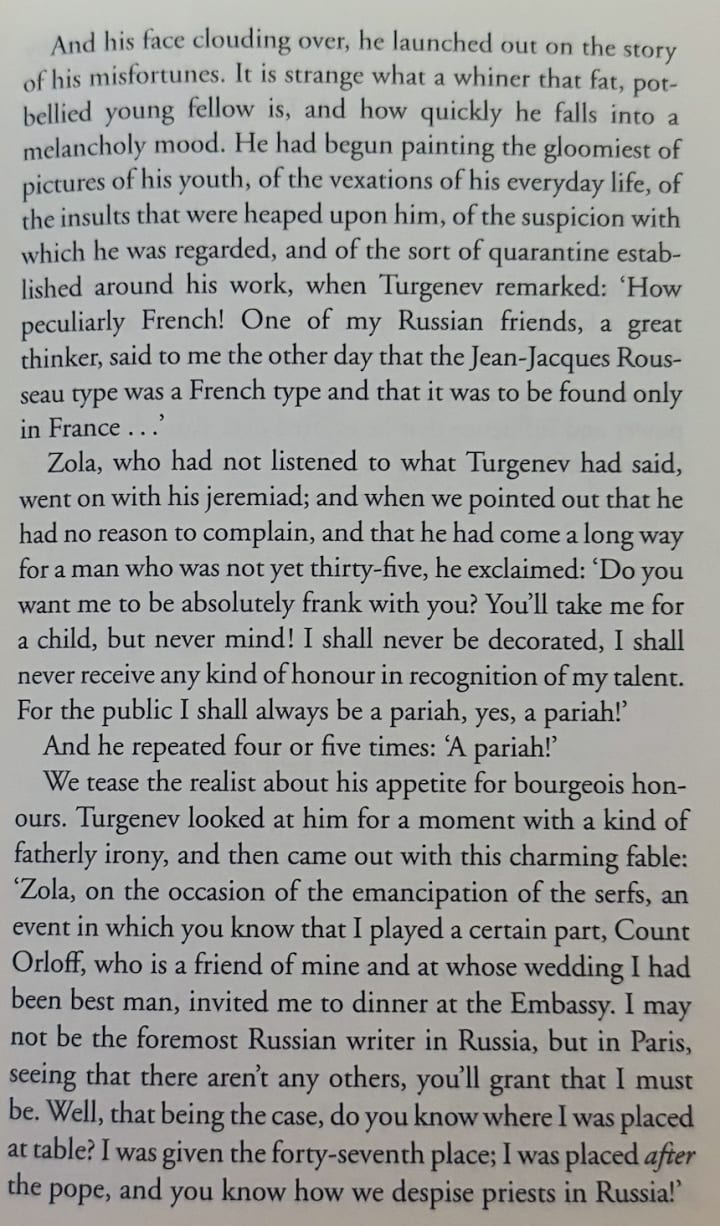 There's a diary as well, one about meeting a whole host of people - mostly authors. The person in question meets Dumas and other incredible names but one of the most iconic people he meets is the writer Emile Zola who tells him about how he writer. Zola writes one hundred lines a day. He often gets drunk and doesn't listen to others very well. But one thing I did find is that there is a beautiful extract from his book L'Assomoir in this book too. It sometimes concerns the way in which the main character contemplates suicide and it is one of the most powerful things he has ever written in my opinion. Once you read the diary in which an on-looker records his situation, you can understand more about his writing, especially how it is included within this book. I have attached part of Zola's exploits below...
