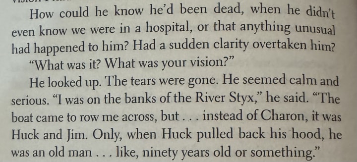 There's a fantastic scene in this essay where the narrator states his half-brother described a vision to him in which he was by the River Styx waiting for the hooded Charon to appear when floating down the river came a boat with this same image. When the figure removed its hood however, it was not Charon but instead, an aged Huckleberry Finn, sitting opposite the character Jim. They row right beside him, leaving him behind. The narrator ruminates on the rowing, stating he was glad Huck and Jim left his brother behind because, as of the book being published, he continued to live unconditionally.