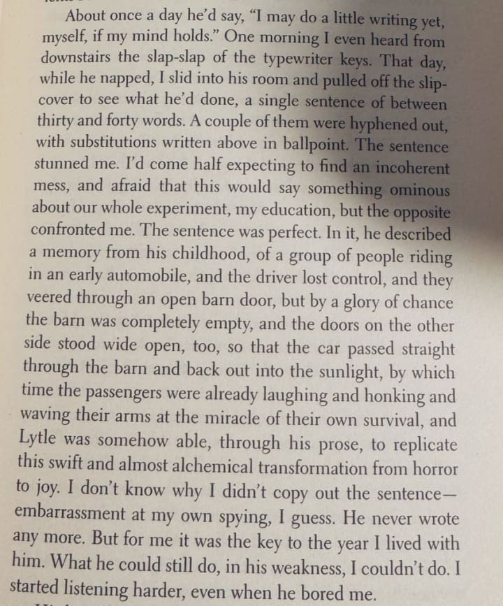 There are several scenes in this essay I enjoyed thoroughly and instead of subjecting you to reading how I'm going to describe them, I've left a photograph of the best one below. It is where our narrator describes Lytle writing a sentence. Just one. The sentence is about something bizarre but it's a perfect sentence nonetheless.