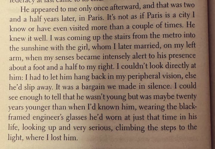 There's another one where he sees the old man's ghost whilst in Paris and I just think this sort of writing needs to be shared. I probably read this paragraph five or six times - and each time it simply didn't lose its pull. There's something hauntingly beautiful yet darkly comical about it. Take a look at this: