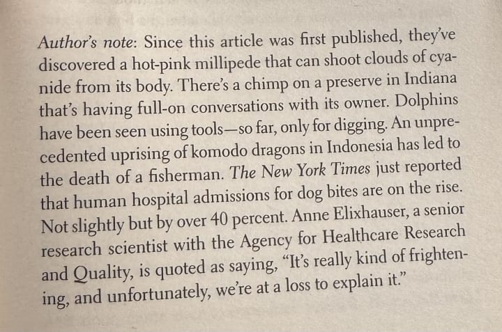 This essay is a playful yet thought-provoking exploration of humanity’s relationship with animals, framed around the bizarre question of whether animals might one day rise up against humans. Combining wit, satire, and genuine curiosity, Sullivan blurs the line between serious inquiry and absurd speculation, crafting a narrative that examines our understanding of animal behaviour and the ethical dimensions of human-animal interactions. It begins with Sullivan recounting a peculiar claim made by a scientist about animals increasingly attacking humans. From this premise, he embarks on a wide-ranging investigation, blending anecdotes, interviews, and historical accounts. He examines cases of unexpected aggression by animals, such as dolphins or birds, and considers their possible implications. Along the way, Sullivan delves into evolutionary biology, environmental changes, and humanity’s exploitation of the natural world, all while maintaining a tone of sceptical humour.
