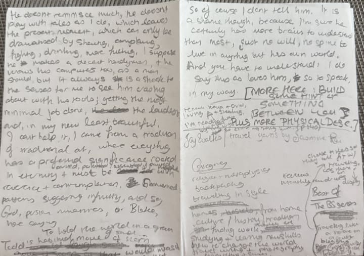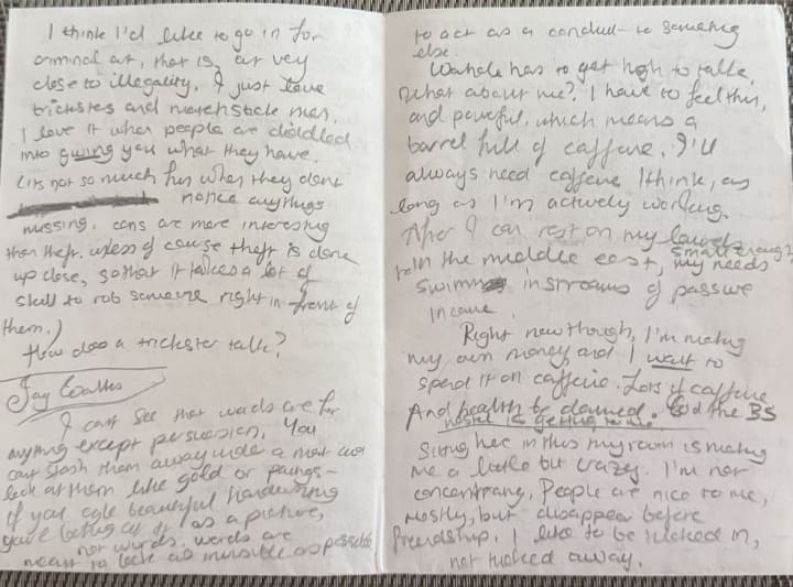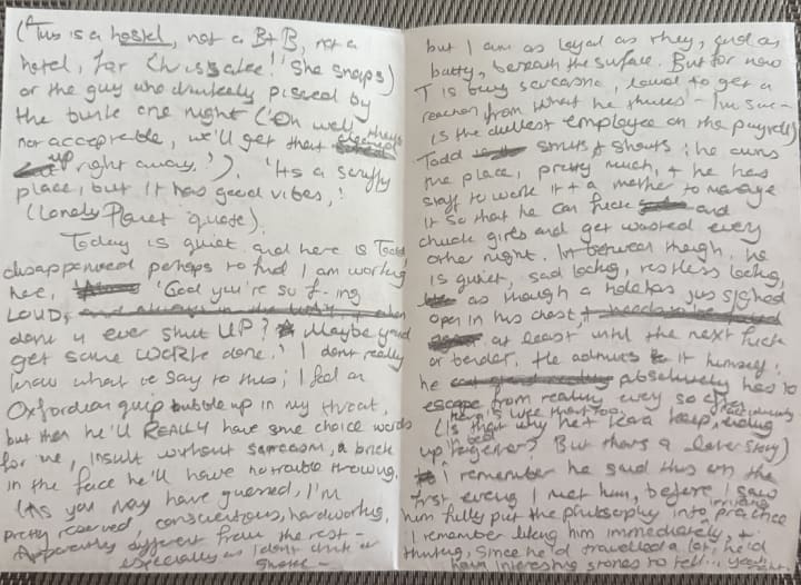 There was an advertisement for a cafe in Glasgow plus a piece of paper. On the piece of paper was a narrative written by the same person who did the annotations (I assume because the handwriting is the same. The capital 'S' is very curvy and styled with a spiral in both cases). This narrative is about the person's stay at somewhere called the 'Blue Sky Hostel' (when I looked it up, it actually existed and it was very weird what I found). I couldn't read it all because I don't know what order it goes in and there are some words I can't really make out. I'll attach the photos on to this review if you'd like to be a sleuth.