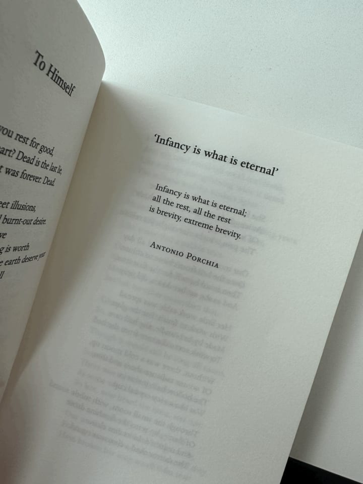 One of the best poems in the anthology is entitled ‘Infancy is what is eternal’ by Antonio Porchia. It covers how everything past infancy is brevity and the wording kind of fascinates me. It proves to the reader that you do not necessarily require lots of convoluted phrases and similes to be able to tell us a story or send us a message. The poem is only three lines and yet, it touches the soul with its idea that after being an infant, life is nothing but concise and exact. Only infancy is whimsical and free enough to not be tied down by ideas or words. The other way to look at it is that after infancy dies there can only be strict rules to life that, if not followed, will lead to sadness, depression and death. Infancy, therefore, is the only eternal ideal.