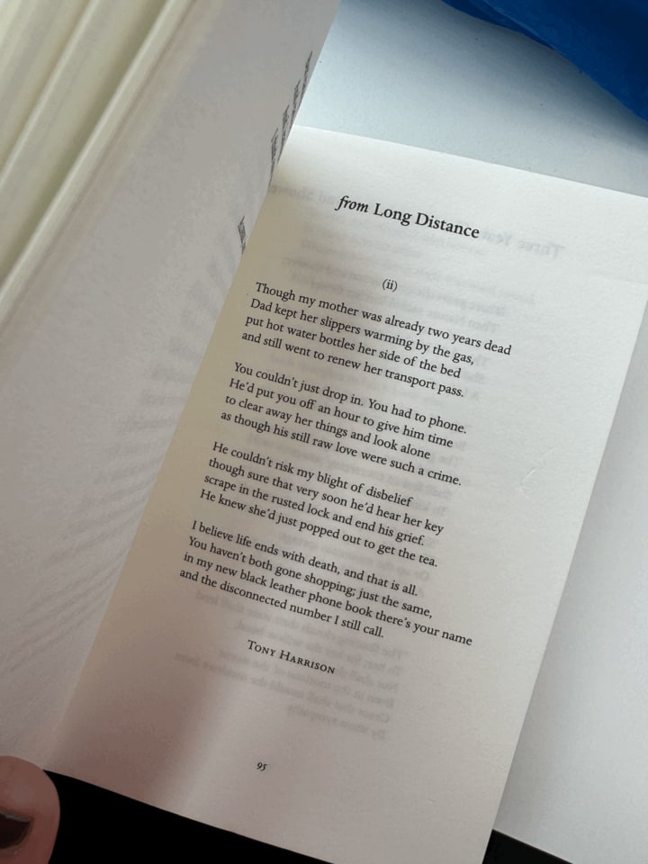 Another poem I enjoyed was called ‘(from) Long Distance’ by Tony Harrison. This is a narrative poem which begins with the narrator’s father still heating up his dead wife’s water bottle and waiting for her to walk in through the door after getting the tea. But alas, she never does because she has been long dead. The father still performs tasks though - as if she is still there. This is a beautiful sentiment and very sad. Yet, the narrator thinks this is a bit silly. As the poem goes on, it is clear that in the present day, the father is dead as well. The poem ends with the narrator admitting he still calls his parents’ disconnected phone number. A poem about how a narrator comes to realise that emotions of grieving cannot be explained, articulated or defined - sometimes actions just happen - it proves to us that not every story has to have a beginning, a middle and an end. Instead, we can go right back to the beginning in a different way as a mode of realisation. I also loved this poem for its ability to remain simple in its language. It definitely sounds as though it is recent and through this, the poet conveys some extremely complex emotions.