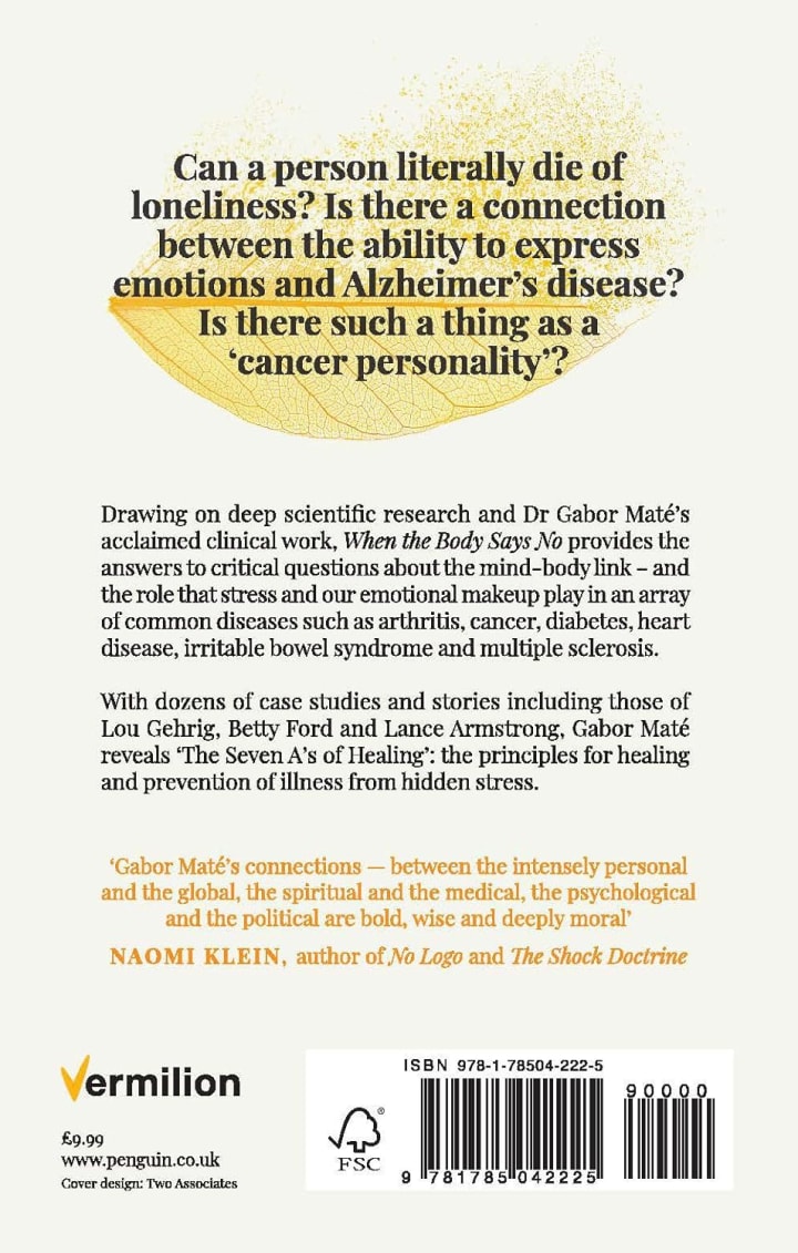 Maté argues that the mind and body are deeply interconnected, meaning that emotional and psychological factors play a significant role in physical health. Diseases like cancer, multiple sclerosis (MS), and arthritis, he asserts, are often linked to chronic stress and emotional repression. The body "says no" when it can no longer cope with the accumulated stress, leading to illness. This is all well and good and I think anyone could figure this out. But to state that this is the beginning cause for each or even most of the cases of these illnesses might be a little fantastical.